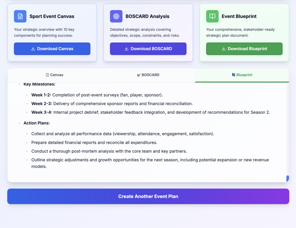 • 1. The Sport Event Canvas: A powerful, one-page visual chart that maps out your entire event, from its core purpose and value proposition to its key stakeholders and revenue streams.